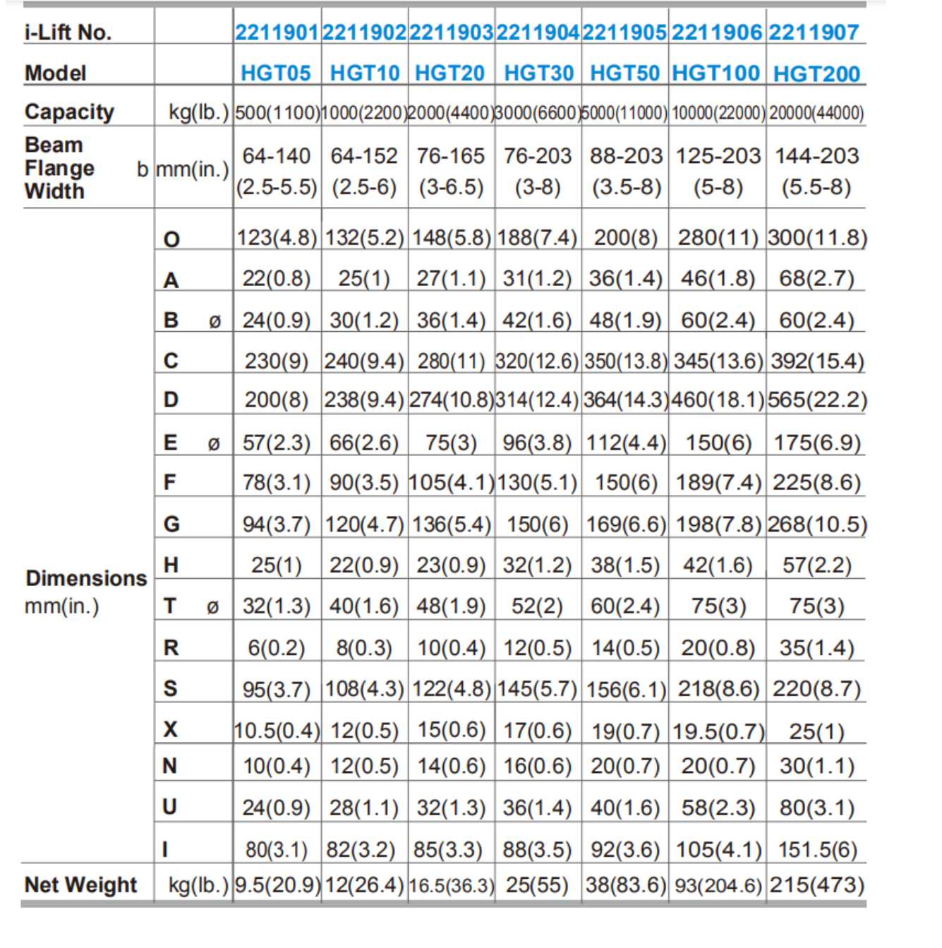 HGT20 2000kg (4400lbs) বিম ফ্ল্যাঞ্জ প্রস্থ সহ: 76-165mm (3-6.5in।);